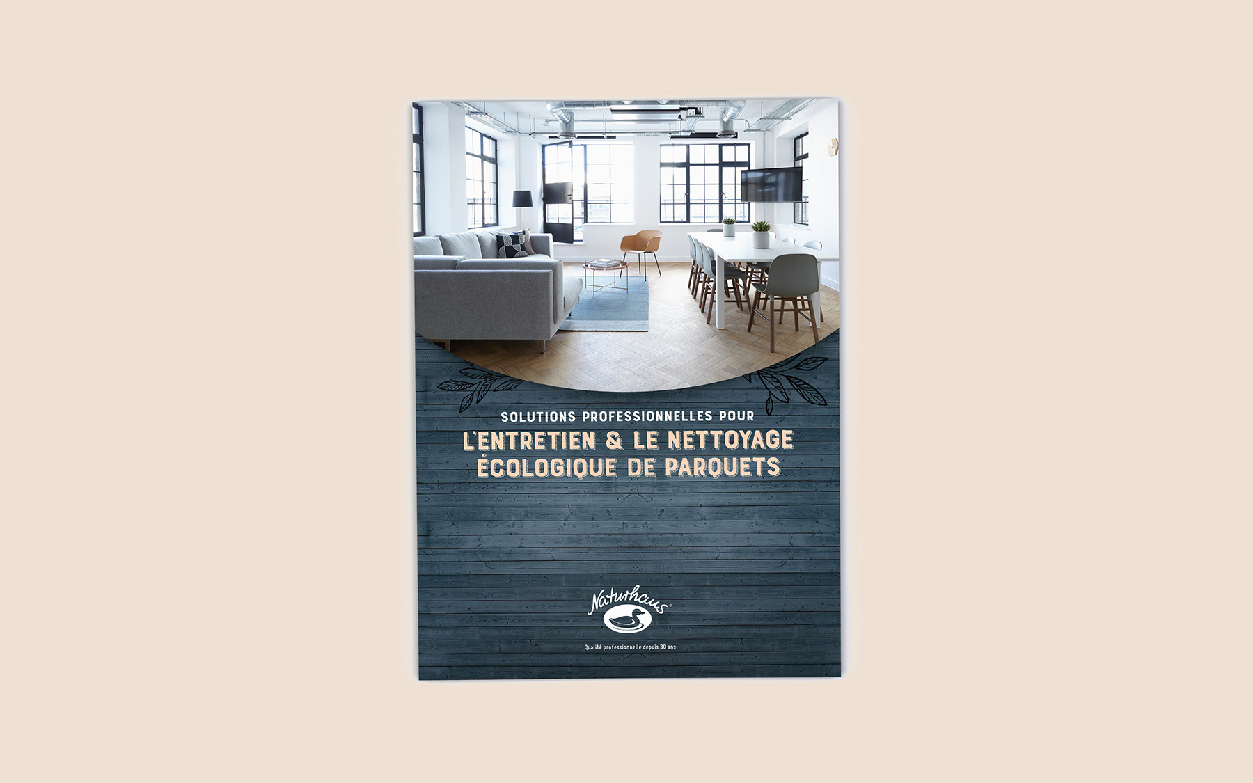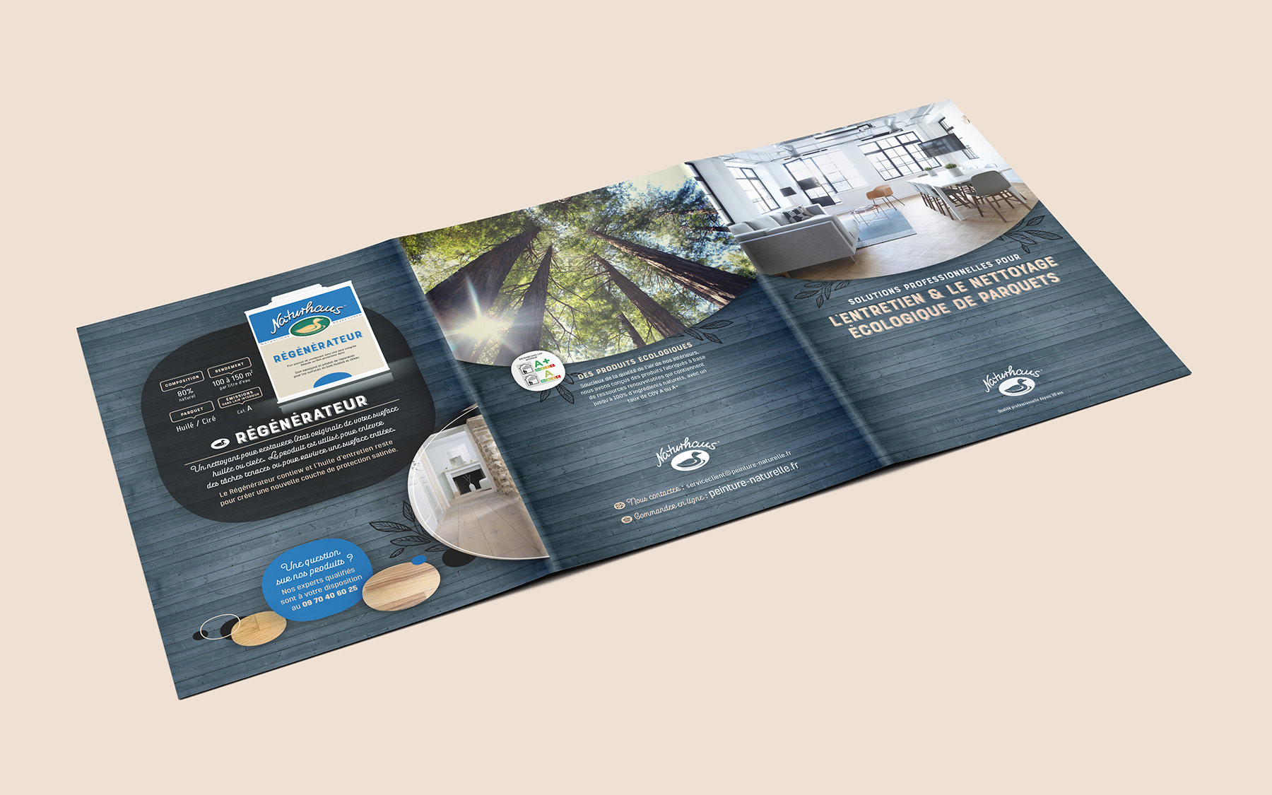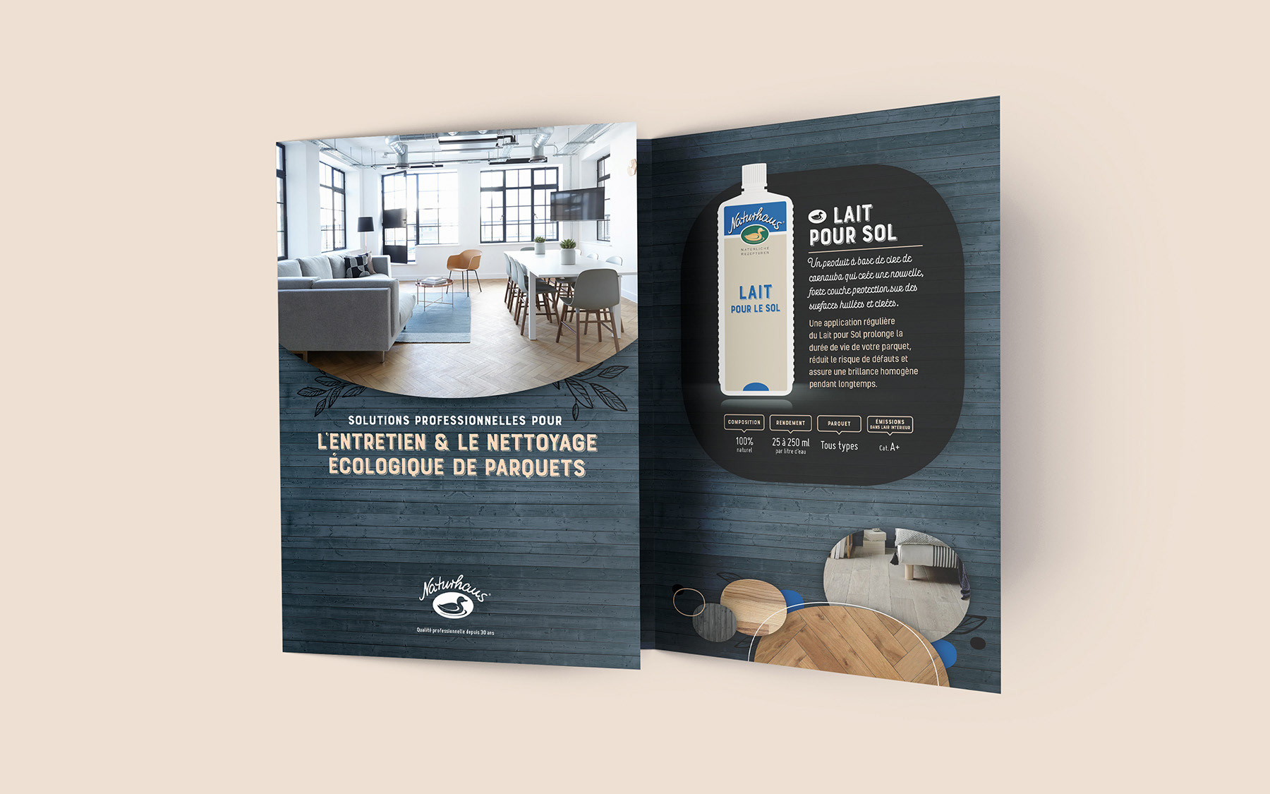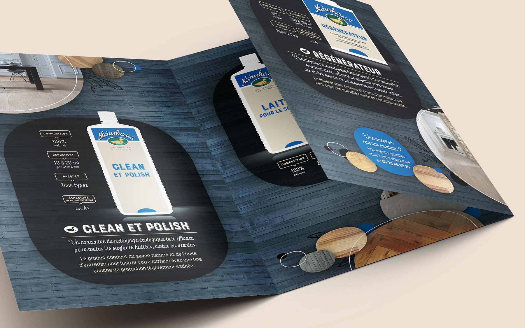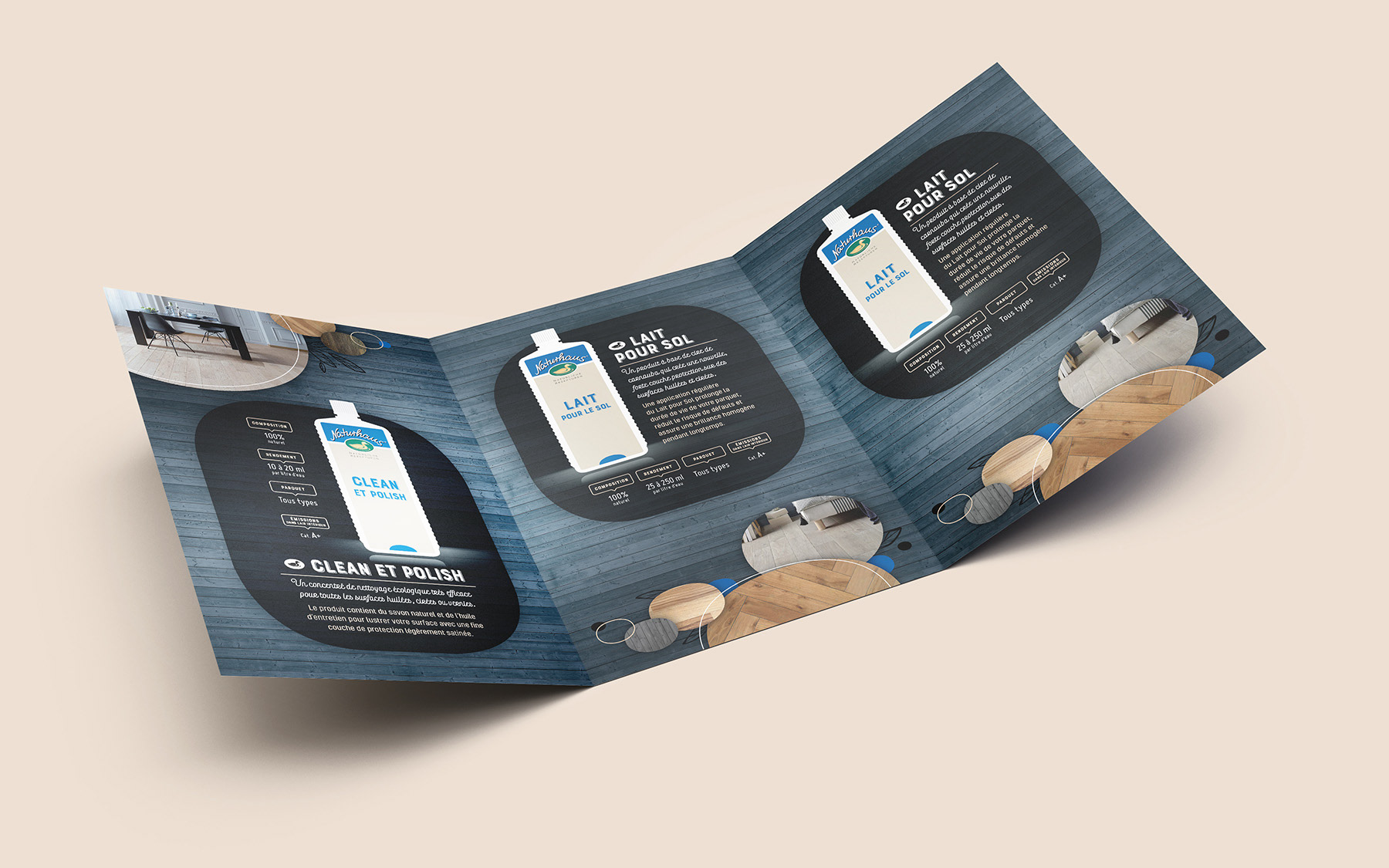 Conception graphique d’une plaquette de présentation pour une marque de produits d’entretien naturels pour sols et parquets, à l’occasion de son lancement sur le marché français.